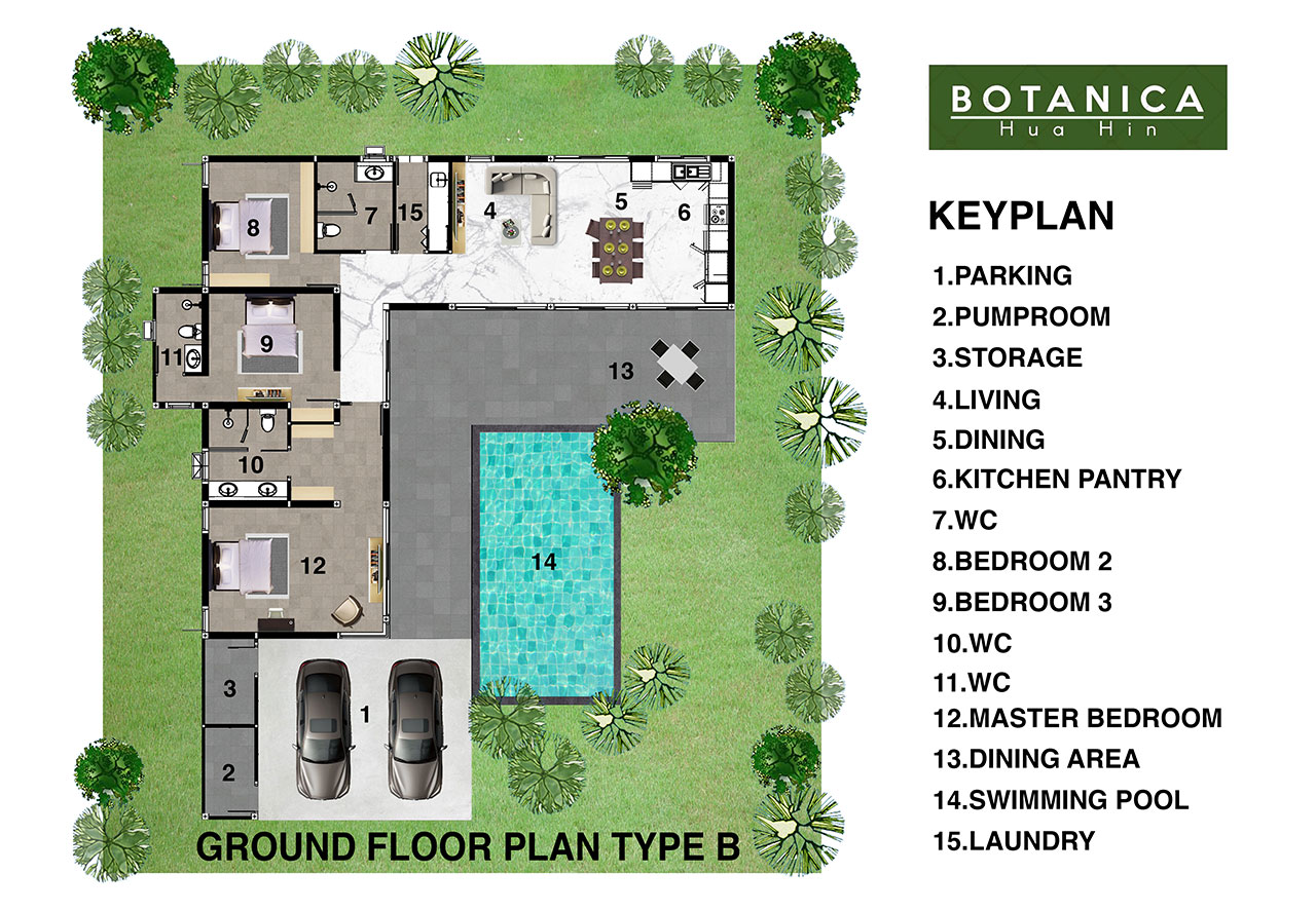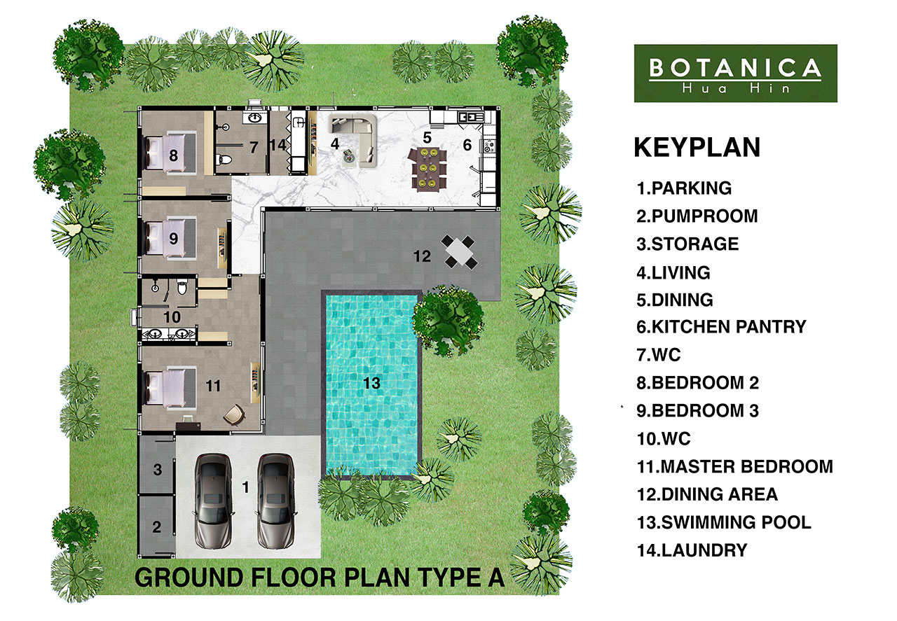 Botanica Hua Hin ist keine gewöhnliche Wohnanlage. Diese Immobilie präsentiert eine Vielzahl prächtiger Merkmale, angefangen bei ihren großzügigen Grundstücken. Mit Größen von 500 qm und mehr bietet Botanica Hua Hin Ihnen Raum zum Atmen und Leben im Überfluss.