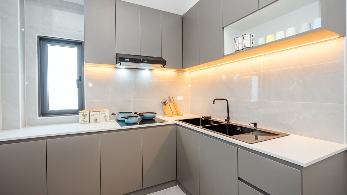 • Einbauküche mit Schränken, Elektroherd und Dunstabzug
