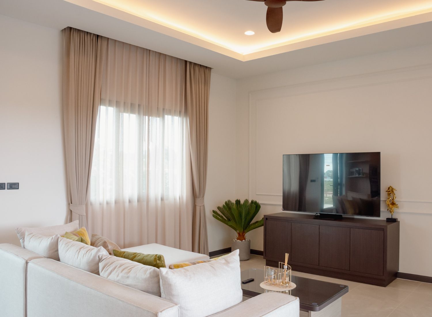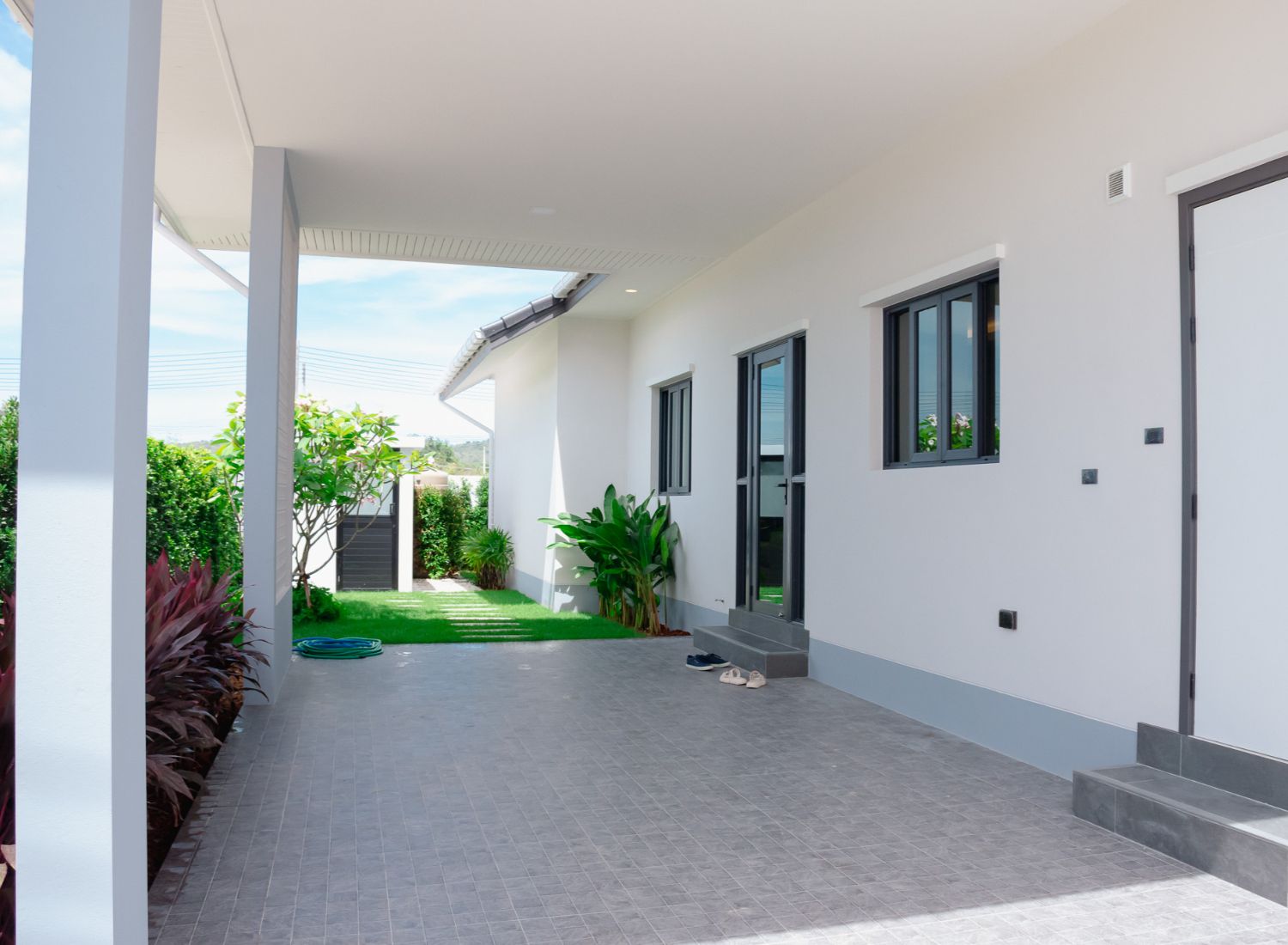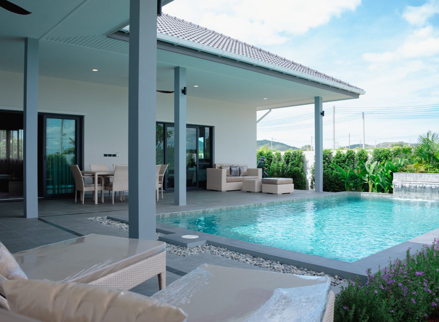 Der Reiz der Nantra Villa erstreckt sich über ihre Mauern hinaus, mit großzügigen überdachten Terrassen, die es Ihnen ermöglichen, den tropischen Charme des Klimas von Hua Hin zu genießen und gleichzeitig die atemberaubende Aussicht auf den Westen zu genießen. Genießen Sie eine konstante sanfte Brise, die Ihre Sinne streichelt und eine wohltuende Atmosphäre schafft, die Körper und Geist belebt.