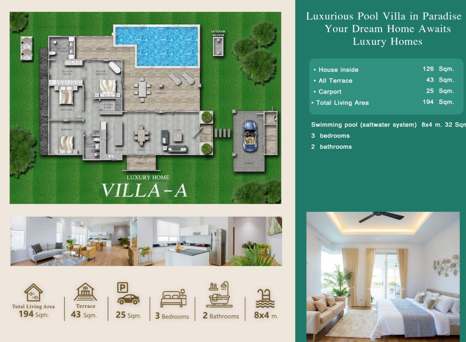 Wohnfläche 194 sqm, Haus innen 126 sqm, 3 Schlaf-, 2 Badezimmer, Pool 8×4 m
