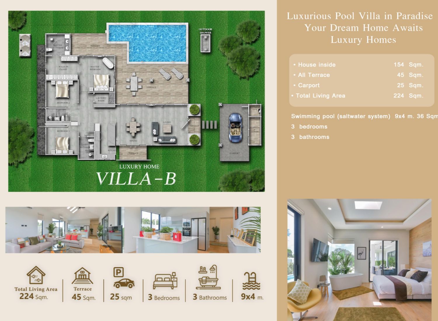 Wohnfläche 224 sqm, Haus innen 154 sqm, 3 Schlaf-, 3 Badezimmer, Pool 9×4 m