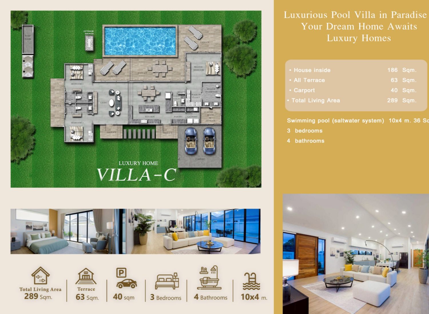Wohnfläche 289 sqm, Haus innen 186 sqm, 3 Schlaf-, 4 Badezimmer, Pool 10×4 m