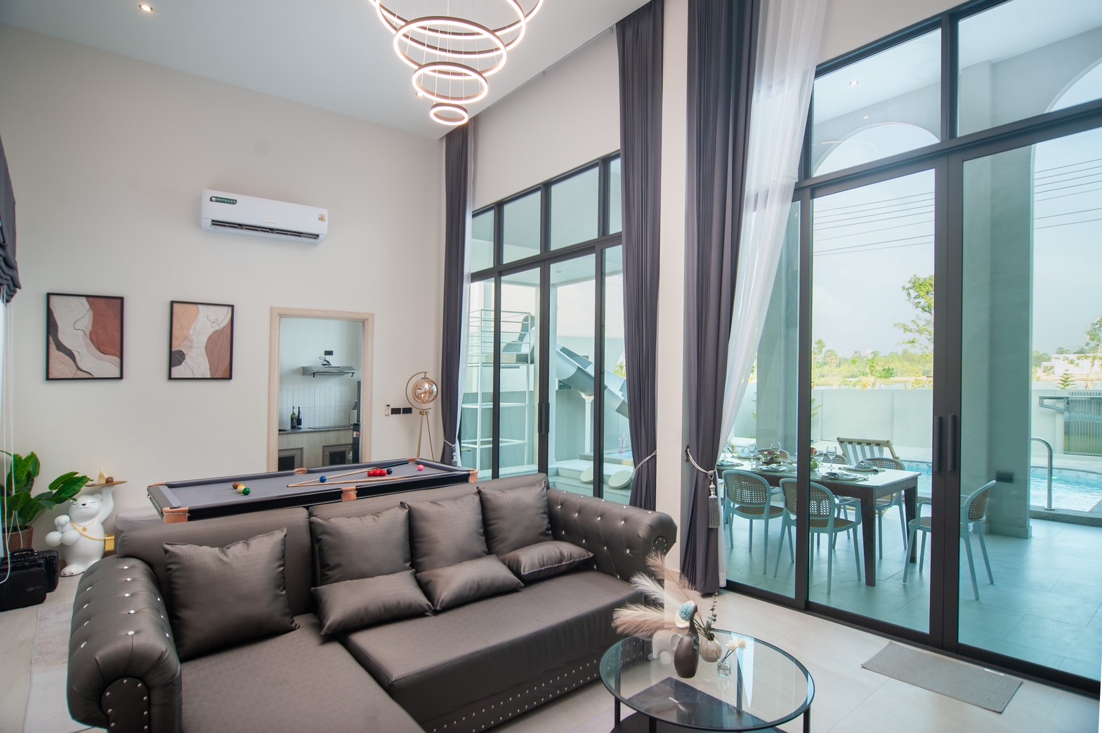 - Geräumige Wohnflächen: Die Villen sind mit offenen, lichtdurchfluteten Grundrissen ausgestattet, die eine nahtlose Verbindung zwischen Innen- und Außenbereichen ermöglichen. Große Fensterfronten bieten atemberaubende Ausblicke auf die Gartenlandschaften und den Poolbereich.